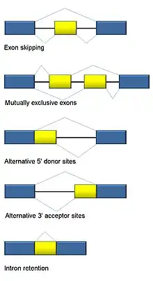 Five basic modes of alternative splicing are generally recognized.[1][2][6][22]