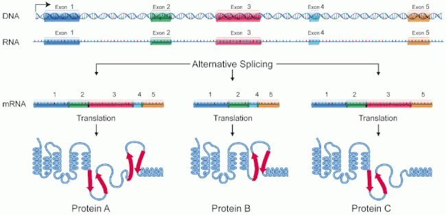 - ↑ 14.0 14.1 14.2 Leff SE, Rosenfeld MG, Evans RM (1986). "Complex transcriptional units: diversity in gene expression by alternative RNA processing". Annual Review of Biochemistry. 55 (1): 1091–117. doi:10.1146/annurev.bi.55.070186.005303. PMID 3017190.