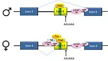 This is an example of exon skipping. The intron upstream from exon 4 has a polypyrimidine tract that doesn't match the consensus sequence well, so that U2AF proteins bind poorly to it without assistance from splicing activators. This 3' splice acceptor site is therefore not used in males. Females, however, produce the splicing activator Transformer (Tra) (see below). The SR protein Tra2 is produced in both sexes and binds to an ESE in exon 4; if Tra is present, it binds to Tra2 and, along with another SR protein, forms a complex that assists U2AF proteins in binding to the weak polypyrimidine tract. U2 is recruited to the associated branchpoint, and this leads to inclusion of exon 4 in the mRNA.[39][40]