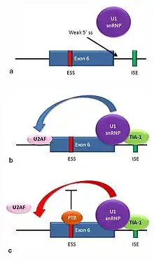 - Binding of TIA-1 protein to an intronic splicing enhancer site stabilizes binding of the U1 snRNP.[6] The resulting 5' donor site complex assists in binding of the splicing factor U2AF to the 3' splice site upstream of the exon, through a mechanism that is not yet known (see b).[42]