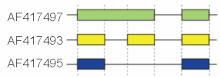 These modes describe basic splicing mechanisms, but may be inadequate to describe complex splicing events. For instance, the figure to the right shows 3 spliceforms from the mouse hyaluronidase 3 gene. Comparing the exonic structure shown in the first line (green) with the one in the second line (yellow) shows intron retention, whereas the comparison between the second and the third spliceform (yellow vs. blue) exhibits exon skipping. A model nomenclature to uniquely designate all possible splicing patterns has recently been proposed.[22]