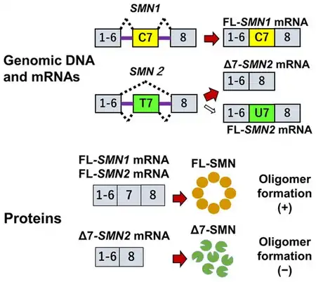 - ↑ Nishio, Hisahide; Niba, Emma Tabe Eko; Saito, Toshio; Okamoto, Kentaro; Takeshima, Yasuhiro; Awano, Hiroyuki (26 July 2023). "Spinal Muscular Atrophy: The Past, Present, and Future of Diagnosis and Treatment". International Journal of Molecular Sciences. 24 (15): 11939. doi:10.3390/ijms241511939. ISSN 1422-0067.