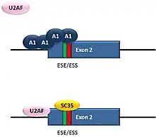 HIV, the retrovirus that causes AIDS in humans, produces a single primary RNA transcript, which is alternatively spliced in multiple ways to produce over 40 different mRNAs.[43] Equilibrium among differentially spliced transcripts provides multiple mRNAs encoding different products that are required for viral multiplication.[44] One of the differentially spliced transcripts contains the tat gene, in which exon 2 is a cassette exon that may be skipped or included. The inclusion of tat exon 2 in the RNA is regulated by competition between the splicing repressor hnRNP A1 and the SR protein SC35. Within exon 2 an exonic splicing silencer sequence (ESS) and an exonic splicing enhancer sequence (ESE) overlap. If A1 repressor protein binds to the ESS, it initiates cooperative binding of multiple A1 molecules, extending into the 5’ donor site upstream of exon 2 and preventing the binding of the core splicing factor U2AF35 to the polypyrimidine tract. If SC35 binds to the ESE, it prevents A1 binding and maintains the 5’ donor site in an accessible state for assembly of the spliceosome. Competition between the activator and repressor ensures that both mRNA types (with and without exon 2) are produced.[43]