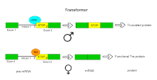 Pre-mRNAs of the Transformer (Tra) gene of Drosophila melanogaster undergo alternative splicing via the alternative acceptor site mode. The gene Tra encodes a protein that is expressed only in females. The primary transcript of this gene contains an intron with two possible acceptor sites. In males, the upstream acceptor site is used. This causes a longer version of exon 2 to be included in the processed transcript, including an early stop codon. The resulting mRNA encodes a truncated protein product that is inactive. Females produce the master sex determination protein Sex lethal (Sxl). The Sxl protein is a splicing repressor that binds to an ISS in the RNA of the Tra transcript near the upstream acceptor site, preventing U2AF protein from binding to the polypyrimidine tract. This prevents the use of this junction, shifting the spliceosome binding to the downstream acceptor site. Splicing at this point bypasses the stop codon, which is excised as part of the intron. The resulting mRNA encodes an active Tra protein, which itself is a regulator of alternative splicing of other sex-related genes (see dsx above).[1]