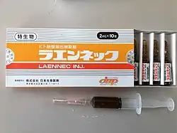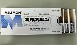 Melsmon Pharmaceutical Co. is a registered pharmaceutical company in Japan, in operation since 1956, that produces pharmaceutical grade placenta extracts from human placenta. The indication is to treat menopause.[3] Laennec, another placenta extract formulation, is prescribed to treat chronic hepatitis. In case of chronic atrophic rhinitis placenta extract is injected to the nasal submucosa.[4] Albert David Limited a Pharmaceutical company from India also manufactures an Injection from fresh human Placenta called Inj.Placentrex. 2 ml.