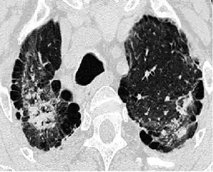 | HRCT-scan of severe aluminosis (with subpleural bullae) | |