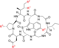 The compounds have a similar structure, that of eight amino-acid residues arranged in a conserved macrobicyclic motif (an overall pentacyclic structure when counting the rings inherent in the proline and tryptophan-derived residues); they were isolated in 1941 by Heinrich O. Wieland and Rudolf Hallermayer.[2] All amatoxins are cyclic peptides that are synthesized as 35-amino-acid proproteins, from which the final eight amino acids are cleaved by a prolyl oligopeptidase.[3] The schematic amino acid sequence of amatoxins is Ile-Trp-Gly-Ile-Gly-Cys-Asn-Pro with cross-linking between Trp and Cys via the sulfoxide (S=O) moiety and hydroxylation in variants of the molecule; enzymes for these processings steps remain unknown.