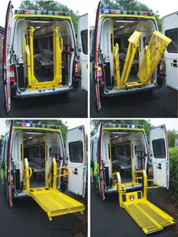 - Tail lift or ramp – Ambulances can be fitted with a tail lift or ramp in order to facilitate loading a patient without having to undertake any lifting. This is especially important where the patient is obese or specialty care transports that require large, bulky equipment such as a neonatal incubator or hospital beds. There may also be equipment linked to this such as winches which are designed to pull heavy patients into the vehicle.[55]