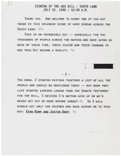 I know there may have been concerns that the ADA may be too vague or too costly, or may lead endlessly to litigation. But I want to reassure you right now that my administration and the United States Congress have carefully crafted this Act. We've all been determined to ensure that it gives flexibility, particularly in terms of the timetable of implementation; and we've been committed to containing the costs that may be incurred.... Let the shameful wall of exclusion finally come tumbling down.[54]