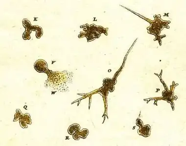 The earliest record of an amoeboid organism was produced in 1755 by August Johann Rösel von Rosenhof, who named his discovery "Der Kleine Proteus" ("the Little Proteus").[44] Rösel's illustrations show an unidentifiable freshwater amoeba, similar in appearance to the common species now known as Amoeba proteus.[45] The term "Proteus animalcule" remained in use throughout the 18th and 19th centuries, as an informal name for any large, free-living amoeboid.[46]