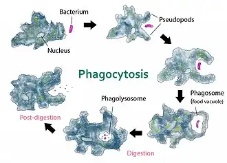 Amoebae typically ingest their food by phagocytosis, extending pseudopods to encircle and engulf live prey or particles of scavenged material. Amoeboid cells do not have a mouth or cytostome, and there is no fixed place on the cell at which phagocytosis normally occurs.[18]