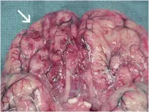 | Primary amoebic meningoencephalitis (exudate and hemorrhage of frontal cerebral cortex) | |