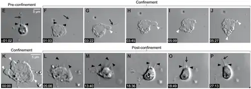 The choanoflagellate Salpingoeca rosetta can switch between a swimming (flagellate) stage and a crawling (amoeboid) stage when subjected to a confined space.[3]
