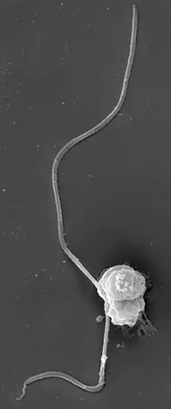 Cavalier-Smith[3] originally proposed that unikonts ancestrally had a single flagellum and single basal body. This is unlikely, however, as flagellated opisthokonts, as well as some flagellated Amoebozoa, including Breviata, actually have two basal bodies, as in typical 'bikonts' (even though only one is flagellated in most unikonts). This paired arrangement can also be seen in the organization of centrioles in typical animal cells. In spite of the name of the group, the common ancestor of all 'unikonts' was probably a cell with two basal bodies.