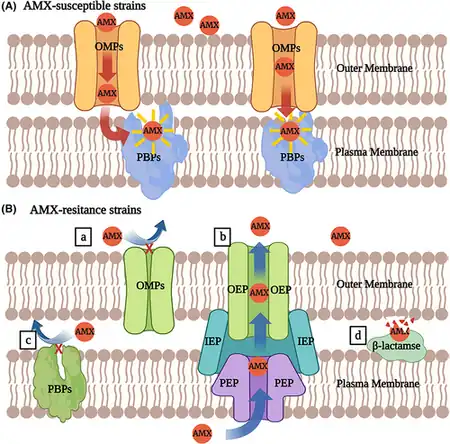 H. pylori can mutate the genes encoding PBPs, like pbp1A, reducing amoxicillins ability to bind/inhibit cell wall synthesis.Membrane proteins expel antibiotics from the bacterial cell. Overexpression of efflux pumps in H. pylori decreases intracellular concentrations of amoxicillin, therefore reducing its effectiveness[47][43]