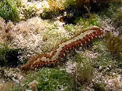 Amphinomidae, also known as the fireworms, bristle worms or sea mice,[2] are a family of marine polychaetes, many species of which bear chaetae mineralized with carbonate.[3] The best-known amphinomids are the fireworms, which can cause great pain if their toxin-coated chaetae are touched or trodden on.[4] Their relationship to other polychaete groups is somewhat poorly resolved.[4]