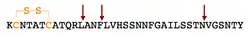 The human form of IAPP has the amino acid sequence KCNTATCATQRLANFLVHSSNNFGAILSSTNVGSNTY, with a disulfide bridge between cysteine residues 2 and 7. Both the amidated C-terminus and the disulfide bridge are necessary for the full biological activity of amylin.[8] IAPP is capable of forming amyloid fibrils in vitro. Within the fibrillization reaction, the early prefibrillar structures are extremely toxic to beta-cell and insuloma cell cultures.[8] Later amyloid fiber structures also seem to have some cytotoxic effect on cell cultures. Studies have shown that fibrils are the end product and not necessarily the most toxic form of amyloid proteins/peptides in general. A non-fibril forming peptide (1–19 residues of human amylin) is toxic like the full-length peptide but the respective segment of rat amylin is not.[17][18][19] It was also demonstrated by solid-state NMR spectroscopy that the fragment 20-29 of the human-amylin fragments membranes.[20] Rats and mice have six substitutions (three of which are proline substitutions at positions 25, 28 and 29) that are believed to prevent the formation of amyloid fibrils, although not completely as seen by its propensity to form amyloid fibrils in vitro.[21][22] Rat IAPP is nontoxic to beta-cells when overexpressed in transgenic rodents.