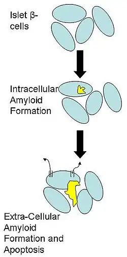 ProIAPP has been linked to Type 2 diabetes and the loss of islet β-cells.[28] Islet amyloid formation, initiated by the aggregation of proIAPP, may contribute to this progressive loss of islet β-cells. It is thought that proIAPP forms the first granules that allow for IAPP to aggregate and form amyloid which may lead to amyloid-induced apoptosis of β-cells.