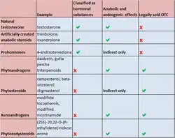 Designer steroids are AAS that have not been approved and marketed for medical use but have been distributed through the black market.[78] Examples of notable designer steroids include 1-testosterone (dihydroboldenone), methasterone, trenbolone enanthate, desoxymethyltestosterone, tetrahydrogestrinone, and methylstenbolone.[78]