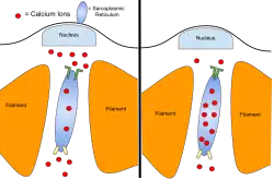 As muscles contract, Calcium ions are released from the sarcoplasmic reticulum by release channels. These channels close and calcium pumps open to relax muscles. After extended exercise, the release channels can begin to leak and cause muscle fatigue.