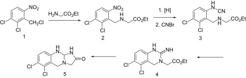 Condensation of benzyl chloride 1 with ethyl ester of glycine gives alkylated product 2. Reduction of the nitro group leads to the aniline and reaction of this with cyanogen bromide possibly gives cyanamide 3 as the initial intermediate. Addition of the aliphatic would then lead to formation of the quinazoline ring (4). Amide formation between the newly formed imide and the ester would then serve to form the imidazolone ring, whatever the details of the sequence, there is obtained anagrelide (5).