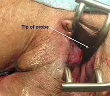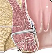 An anal fistula is a abnormal communication between the anal canal and usually the skin around the anus that is long standing in nature.[1][3] Symptoms may include rectal pain and drainage of pus.[1] Complications may include fecal incontinence, anal stenosis, and recurrence of the fistula.[2]
