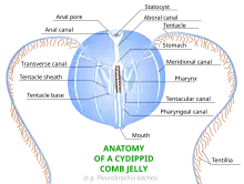 Ctenophores are marine animals which superficially resemble jellyfish, but have biradial symmetry and use eight bands of transverse ciliated plates to swim. All ctenophores possess a pair of small anal pores located adjacent to the apical sensory organ which is thought to control osmotic pressure. These pores have sometimes been interpreted as homologous with the anus of bilaterian animals (worms, humans, snails, fish, etc.). Furthermore, they possess a third tissue layer between the endoderm and ectoderm, another characteristic reminiscent of the Bilateria. Ctenophores possess a functional through-gut from which digested waste products and material distributed via the endodermal canals are expelled to the exterior environment through terminal anal pores, which are specialized to control outflow from the branched endodermal canal system. Ctenophores have no true anus; the central canal opens toward the aboral end by two small pores, through which a small amount of egestion can take place.