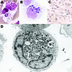 Anaplasma phagocytophilum (formerly Ehrlichia phagocytophilum)[2] is a Gram-negative bacterium that is unusual in its tropism to neutrophils. It causes anaplasmosis in sheep and cattle, also known as tick-borne fever and pasture fever, and also causes the zoonotic disease human granulocytic anaplasmosis.[3]