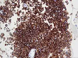 ALK-positive ALCL is diagnosed by histological and immunological examinations of involved tissues, typically lymph nodes. These tissues have lymphoma-like infiltrates that have variable numbers of ALCL "hallmark" cells, i.e. cells with kidney- or horseshoe-shaped nuclei that strongly express CD30 as detected by immunohistochemistry and an ALK fusion protein as detected by fluorescence in situ hybridization.[11] These cells are scattered throughout the infiltrates. WHO classifies these infiltrates into 5 patterns: a common pattern consisting of large variably shaped cells with large nuclei that typically contain multiple nucleoli (60–70% of cases); a small-cell pattern consisting of small to medium-sized neoplastic cells with clear cytoplasm and "hallmark" cells that are concentrated around small blood vessels (5–10% of cases); a lymphohistiocytic pattern consisting of small neoplastic cells along with abundant histiocytes (10% of cases); a Hodgkin's-like pattern in which the architecture resembles the nodular sclerosis pattern of Hodgkin lymphoma (3% of cases); and a composite pattern consisting of two or more of the just described patterns (15% of cases).[9] Detection of circulating autoantibody against ALK supports the diagnosis.[10] Individuals with low levels of these autoantibodies are at an increase risk of relapsing after treatment.[9]