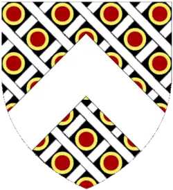 Sable fretty Argent and Bezanty on each Bezant a Roundel Gules over all a Chevron Argent
