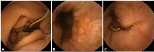 A. duodenale is small, cylindrical worm, greyish-white in color. It has two ventral plates on the anterior margin of the buccal capsule. Each of them has two large teeth that are fused at their bases. A pair of small teeth can be found in the depths of the buccal capsule. Males are 8–11 mm long with a copulatory bursa at the posterior end. Females are 10–13 mm long, with the vulva located at the posterior end; females can lay 10,000 to 30,000 eggs per day. The average lifespan of a female A. duodenale is one year.[2]