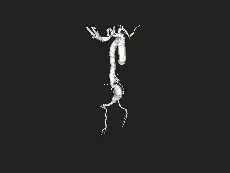 | Angiography of an aneurysm in a brain artery. The aneurysm is the large bulge in the center of the image. | |