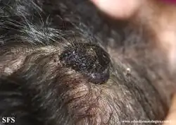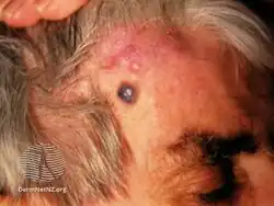 Angiosarcoma is a rare and aggressive cancer that starts in the endothelial cells that line the walls of blood vessels or lymphatic vessels. Since they are made from vascular lining, they can appear anywhere and at any age, but older people are more commonly affected, and the skin is the most affected area, with approximately 60% of cases being cutaneous. Specifically, the scalp makes up ~50% of angiosarcoma cases, but this is still <0.1% of all head and neck tumors.[5][6][7] Since angiosarcoma is an umbrella term for many types of tumor that vary greatly in origin and location, many symptoms may occur, from completely asymptomatic to non-specific symptoms like skin lesions, ulceration, shortness of breath and abdominal pain. Multiple-organ involvement at time of diagnosis is common and makes it difficult to ascertain origin and how to treat it.[7]