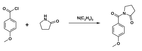 Alternatively, gamma-aminobutyric acid can react with anisoyl chloride. Ring closure can be accomplished in the presence of thionyl chloride.[20]
