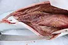 Larval anisakids are common parasites of marine and anadromous fish (e.g. salmon, sardine), and can also be found in squid and cuttlefish. In contrast, they are absent from fish in waters of low salinity, due to the physiological requirements of krill, which are involved in the completion of the worm's life cycle. Anisakids are also uncommon in areas where cetaceans are rare, such as the southern North Sea.[6] Due to having complex life cycles, species specific relationships and their eggs being released in the feces of their definitive host, the identification of anisakids in local fish populations can be a useful tool in assessing the range or migratory patterns of their definitive host.[7]
