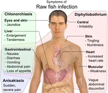 | Differential symptoms of parasite infection by raw fish: Clonorchis sinensis (trematode/fluke), Anisakis (nematode/roundworm) and Diphyllobothrium (cestode/tapeworm),[11] all have gastrointestinal, but otherwise distinct, symptoms.[12][13][14][15] | |