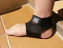 An ankle brace is a garment that is worn around the ankle to protect it or for immobilization while allowing it to heal from sprains and other minor injuries.[1] Ankle braces are used to immobilize the joint while providing heat and compression to the bones. They are common in injury rehabilitation processes that affect the ankle, being made of rigid fabric such nylon[2] and neoprene that allow limited mobility of the foot and conform to the ankle by a hook and loop fastener. To ensure its fixation, the foot portion may include metal pieces. In severe cases, they incorporate metallic plates to better immobilize the joint. Ankle braces may not be adequate in treating more severe sprains and ankle injuries.