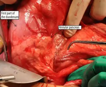 - ↑ De Ugarte DA, Dutson EP, Hiyama DT (2006). "Annular pancreas in the adult: management with laparoscopic gastrojejunostomy". The American Surgeon. 72 (1): 71–3. PMID 16494188.