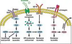 - ↑ Paoli P, Giannoni E, Chiarugi P (2013). "Anoikis molecular pathways and its role in cancer progression". Biochim Biophys Acta. 1833 (12): 3481–3498. doi:10.1016/j.bbamcr.2013.06.026. PMID 23830918.