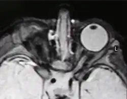 Anophthalmia (Greek: ἀνόφθαλμος, "without eye") is the medical term for the absence of one or both eyes. Both the globe and the ocular tissue are missing from the orbit.[1] The absence of the eye will cause a small bony orbit, a constricted mucosal socket, short eyelids, reduced palpebral fissure and malar prominence.[2] Genetic mutations, chromosomal abnormalities, and prenatal environment can all cause anophthalmia. Anophthalmia is an extremely rare disease and is mostly rooted in genetic abnormalities. It can also be associated with other syndromes.