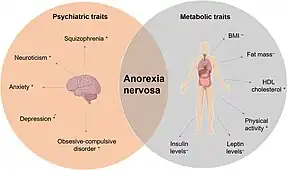 A 2019 study found a genetic relationship with mental disorders, such as schizophrenia, obsessive–compulsive disorder, anxiety disorder and depression; and metabolic functioning with a negative correlation with fat mass, type 2 diabetes and leptin.[63]