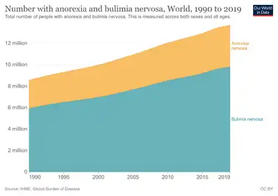 Globally, anorexia is estimated to affect 2.9 million people as of 2015.[9] It is estimated to occur in 0.9% to 4.3% of women and 0.2% to 0.3% of men in Western countries at some point in their life.[14] About 0.4% of young women are affected in a given year and it is estimated to occur ten times more commonly among women than men.[3][14] Rates in most of the developing world are unclear.[3] Often it begins during the teen years or young adulthood.[1] While anorexia became more commonly diagnosed during the 20th century it is unclear if this was due to an increase in its frequency or simply better diagnosis.[2] In 2013 it directly resulted in about 600 deaths globally, up from 400 deaths in 1990.[15] Eating disorders also increase a person's risk of death from a wide range of other causes, including suicide.[1][14] About 5% of people with anorexia die from complications over a ten-year period, a nearly six times increased risk.[3][8] The term "anorexia nervosa" was first used in 1873 by William Gull to describe this condition.[16]
