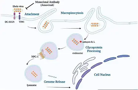 Ansuvimab is a monoclonal antibody therapy that is infused intravenously into patients with Ebola virus disease. Ansuvimab is a neutralizing antibody,[7] meaning it binds to a protein on the surface of Ebola virus that is required to infect cells. Specifically, ansuvimab neutralizes infection by binding to a region of the Ebola virus envelope glycoprotein that, in the absence of ansuvimab, would interact with virus's cell receptor protein, Niemann-Pick C1 (NPC1).[8][9][10] This "competition" by ansuvimab prevents Ebola virus from binding to NPC1 and "neutralizes" the virus's ability to infect the targeted cell.[8]
