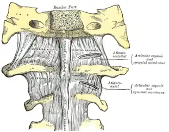 ![]() Anterior atlantooccipital membrane and atlantoaxial ligament. (Anterior longitudinal ligament runs vertically at bottom center.) | |