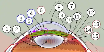 1. Lens, 2. Zonule of Zinn or ciliary zonule, 3. Posterior chamber and 4. Anterior chamber with 5. Aqueous humour flow; 6. Pupil, 7. Corneosclera with 8. Cornea, 9. Trabecular meshwork and Schlemm's canal. 10. Corneal limbus and 11. Sclera; 12. Conjunctiva, 13. Uvea with 14. Iris, 15. Ciliary body.