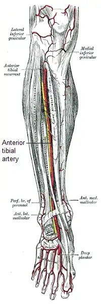 The anterior tibial artery is a branch of the popliteal artery.[1] It originates at the distal end of the popliteus muscle posterior to the tibia. The artery typically passes anterior to the popliteus muscle prior to passing between the tibia and fibula through an oval opening at the superior aspect of the interosseus membrane. The artery then descends between the tibialis anterior and extensor digitorum longus muscles.