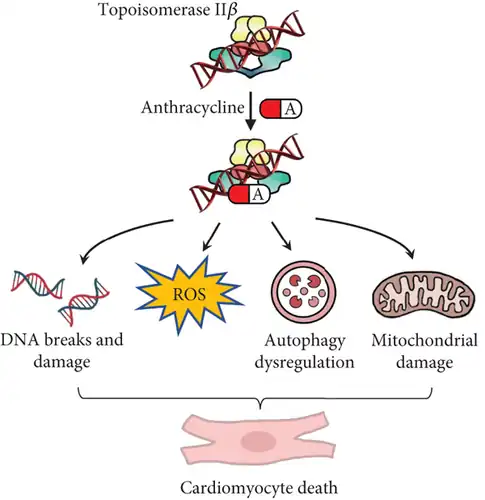 The mechanisms accounting for anthracycline-induced cardiac damage are complex and interrelated. It was first recognised to be related to the oxidative stress induced by anthracyclines.[29] A more recent explanation has emerged, in which anthracycline-mediated cardiotoxicity is due to anthracycline-topoisomerase IIb poisoning, leading to downstream oxidative stress.[37]
