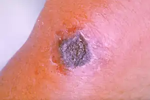 Cutaneous anthrax, also known as hide-porter's disease, is when anthrax occurs on the skin. It is the most common form (>90% of anthrax cases). It is also the least dangerous form (low mortality with treatment, 20% mortality without).[15] Cutaneous anthrax presents as a boil-like skin lesion that eventually forms an ulcer with a black center (eschar). The black eschar often shows up as a large, painless, necrotic ulcer (beginning as an irritating and itchy skin lesion or blister that is dark and usually concentrated as a black dot, somewhat resembling bread mold) at the site of infection. In general, cutaneous infections form within the site of spore penetration between two and five days after exposure. Unlike bruises or most other lesions, cutaneous anthrax infections normally do not cause pain. Nearby lymph nodes may become infected, reddened, swollen, and painful. A scab forms over the lesion soon, and falls off in a few weeks. Complete recovery may take longer.[16] Cutaneous anthrax is typically caused when B. anthracis spores enter through cuts on the skin. This form is found most commonly when humans handle infected animals and/or animal products.[9]