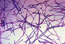 Bacillus anthracis is a rod-shaped, Gram-positive, facultative anaerobic bacterium about 1 by 9 μm in size.[2] It was shown to cause disease by Robert Koch in 1876 when he took a blood sample from an infected cow, isolated the bacteria, and put them into a mouse.[24] The bacterium normally rests in spore form in the soil, and can survive for long periods of time in this state. Herbivores are often infected while grazing, especially when eating rough, irritant, or spiky vegetation. Once ingested or placed in an open wound, the bacteria begin multiplying inside the animal or human and typically kill the host within a few days or weeks. The spores germinate at the site of entry into the tissues and then spread by the circulation to the lymphatics, where the bacteria multiply.[25][26][27]