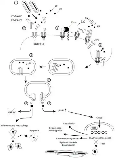 - ↑ Ribot, WJ; Panchal, RG; Brittingham, KC; Ruthel, G; Kenny, TA; Lane, D; Curry, B; Hoover, TA; Friedlander, AM; Bavari, S (September 2006). "Anthrax lethal toxin impairs innate immune functions of alveolar macrophages and facilitates Bacillus anthracis survival". Infection and immunity. 74 (9): 5029–34. doi:10.1128/IAI.00275-06. PMID 16926394. Archived from the original on 30 June 2022. Retrieved 29 June 2022. Archived 30 June 2022 at the Wayback Machine